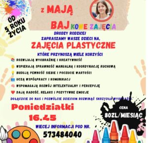 Zapraszamy wszystkie dzieci, które chcą rozpocząć swoją przygodę ze sztuką. Zapewniamy profesjonalną opiekę instruktora oraz przyjazną, inspirującą atmosferę.